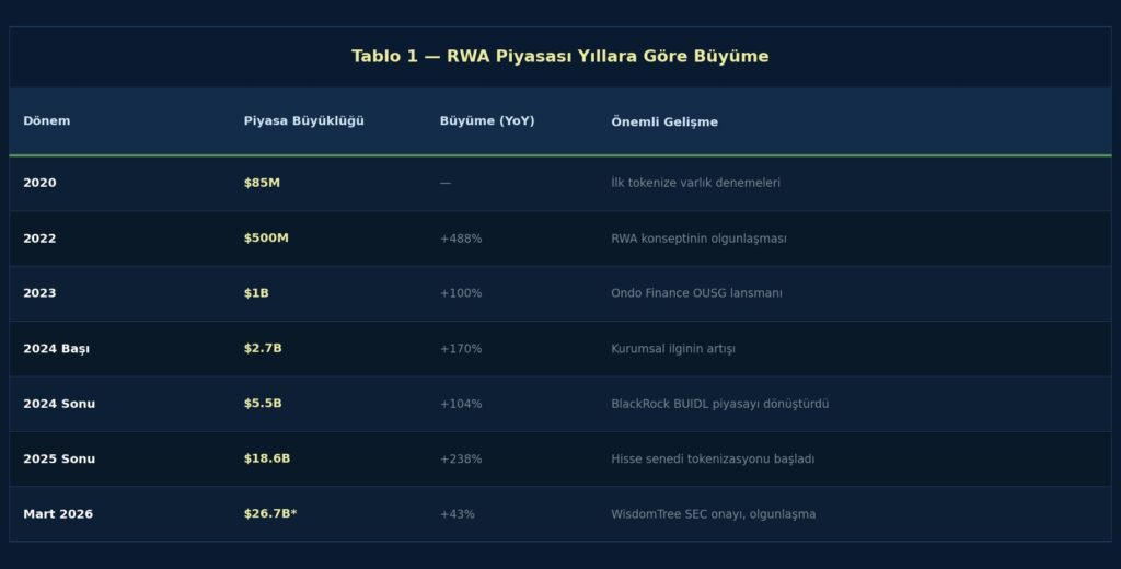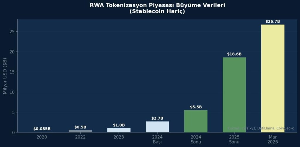 2020’den Mart 2026’ya kadar tokenize RWA piyasası (stablecoin hariç) yaklaşık 314 kat büyüdü, 85 milyon dolardan 26.7 milyar dolara. Bu büyümenin en hızlı aşaması BlackRock’ın BUIDL fonu ile 2024’te yaşandı.