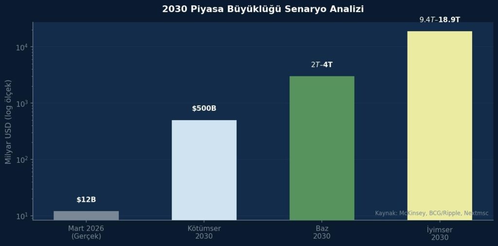 Grafik 4: 2030 Senaryo Analizi (Logaritmik Ölçek) | Kaynak: BCG, McKinsey, Galaxy Digital, Nextmsc