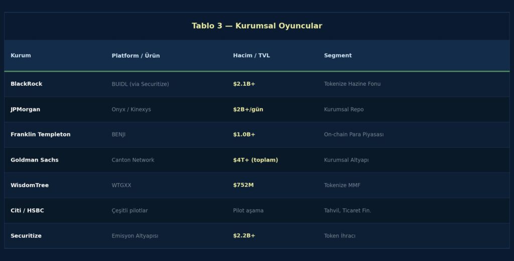 • 2024-2025 — Franklin Templeton BENJI’yi birden fazla blockchain’e taşıdı. JPMorgan Onyx $900B+ tokenize repo işledi.
