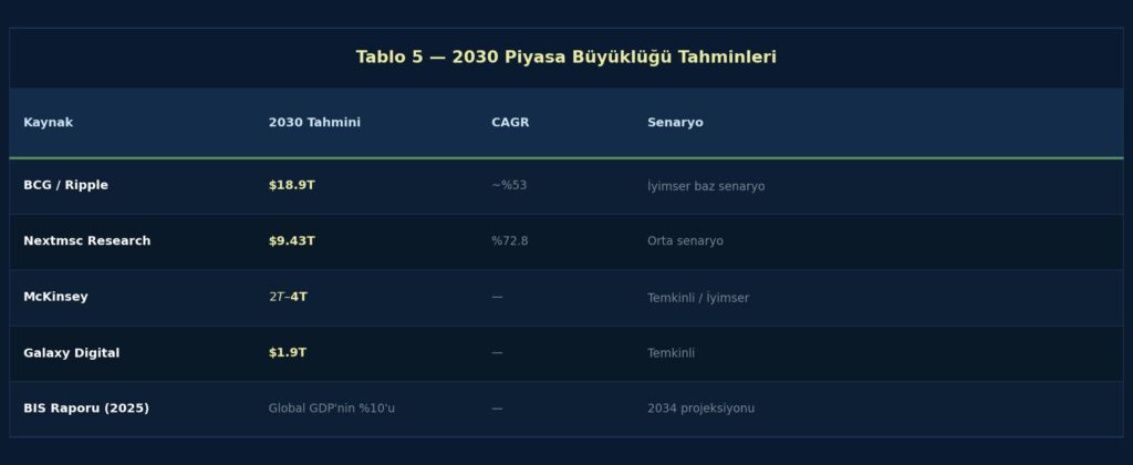 En büyük anlaşmazlık hız konusunda. “Baz” senaryo olan $2–4T dahi mevcut seviyeyi 166–333 kat büyütmek anlamına geliyor. Kritik katalizörler: ABD düzenleyici netliği, ikincil piyasa olgunlaşması ve kurumsal dağıtım kanallarının açılması.